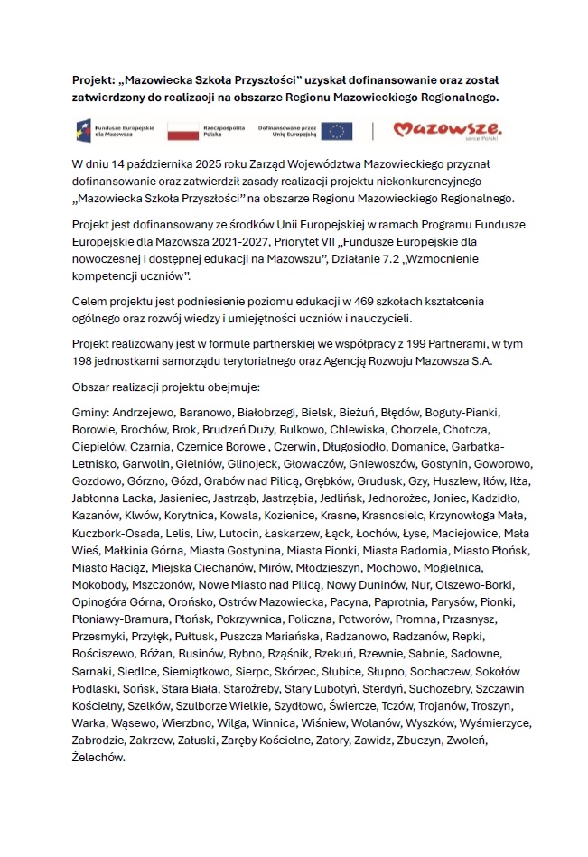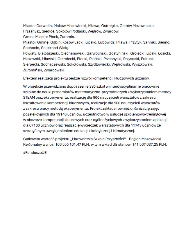 Projekt „Mazowiecka Szkoła Przyszłości” to inwestycja w nowoczesną edukację, lepsze warunki nauki oraz rozwój umiejętności niezbędnych w XXI wieku.
