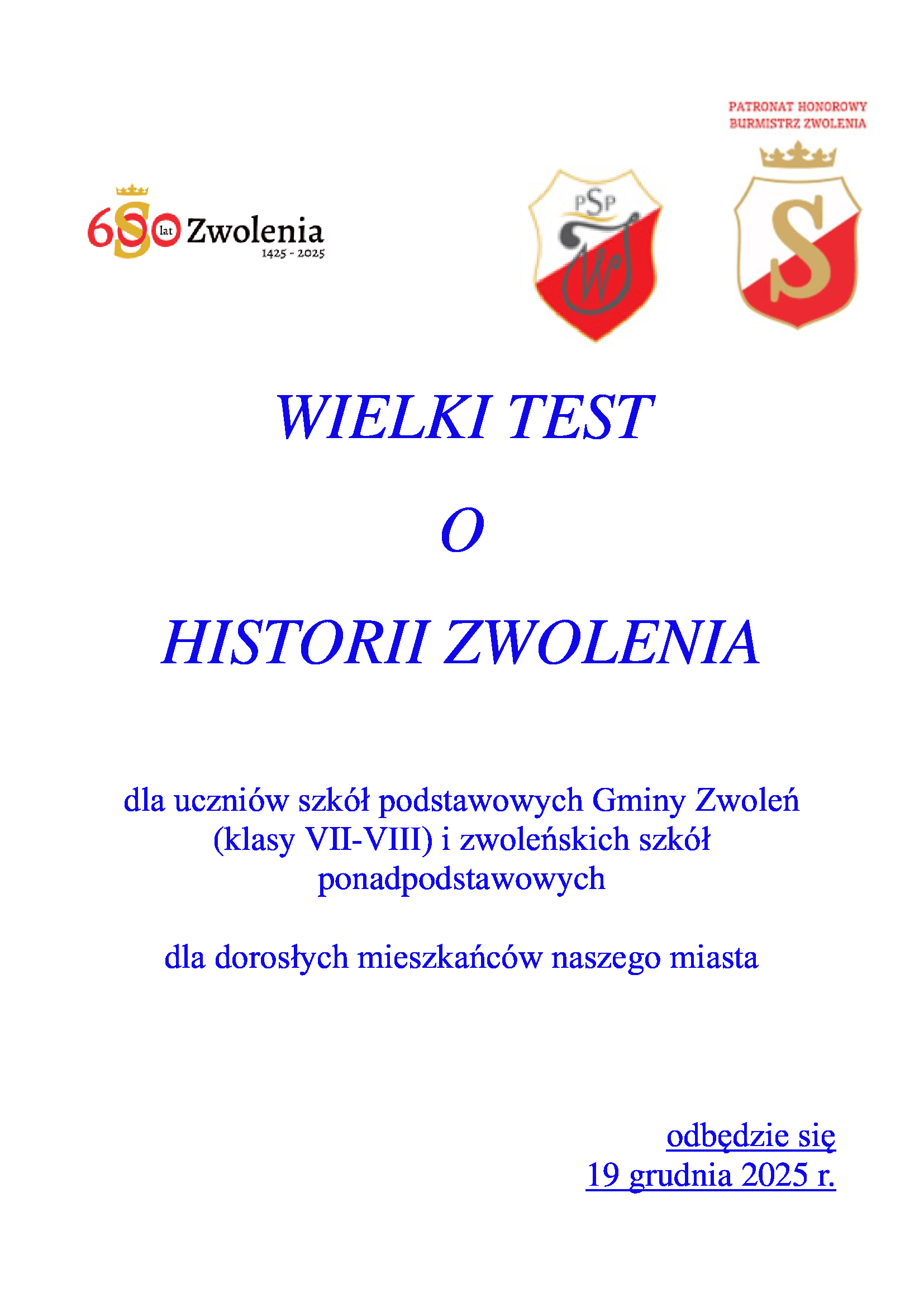 „Wielki test o historii Zwolenia” dla uczniów szkół podstawowych Gminy Zwoleń (klasy VII-VIII), zwoleńskich szkół ponadpodstawowych oraz dla dorosłych mieszkańców naszego miasta odbędzie się 19 grudnia 2025 r. Regulamin konkursu dostępny TUTAJ |