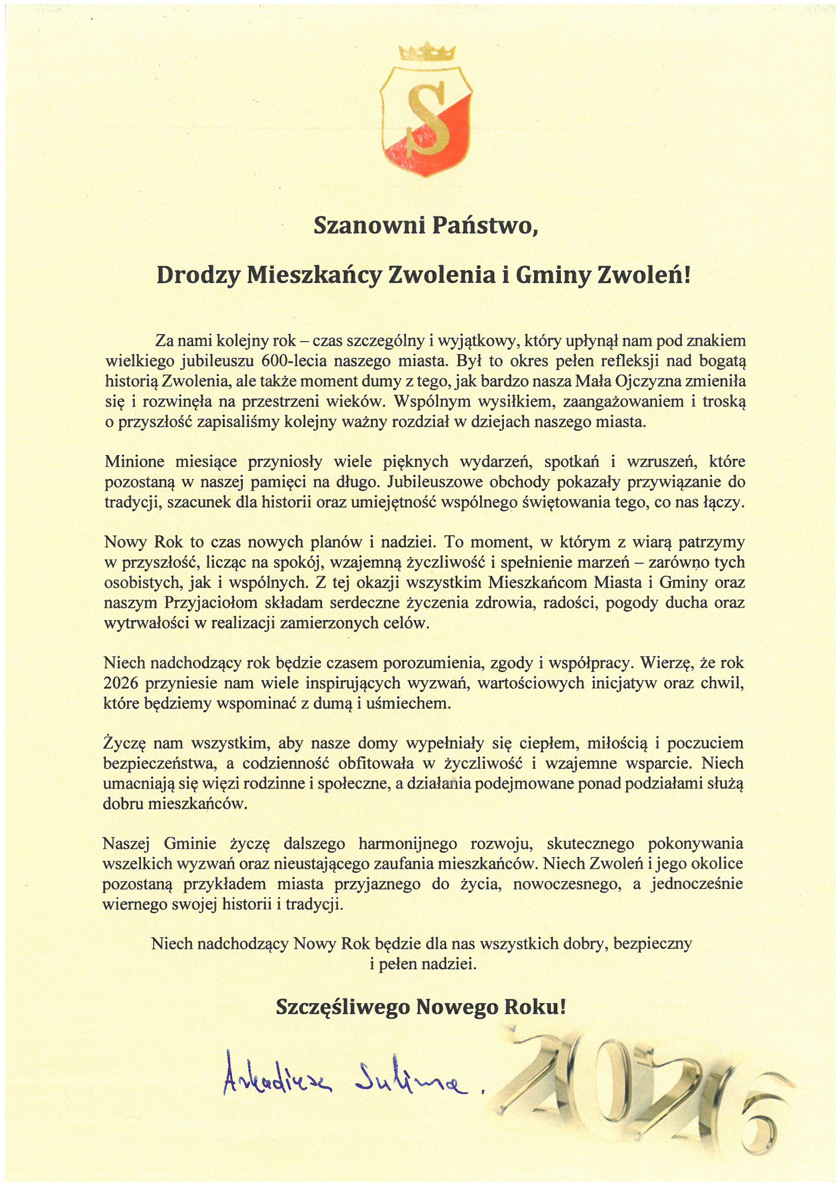 Poniżej zamieszczamy życzenia Burmistrza Zwolenia Arkadiusza Sulimy skierowane do mieszkańców miasta i gminy z okazji zbliżającego się Nowego Roku 2026r.